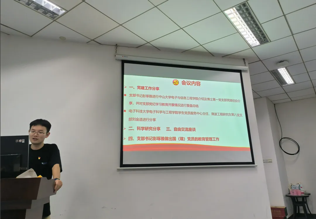 微波工程研究生第八党支部在东校园信息大楼101会议室联合举办“党建学术共融·创新交流启航”主题党日活动。本次活动采用汇报分享的形式,旨在深化党建交流,促进支部建设,增强党员之间的联系与合作,并结合博士第一党支部的特色主题党日活动“学术沙龙”,以期拓展支部党员的学术视野,提升整体学术水平。活动由博士第一党支部书记彭琢雅同志主持。
