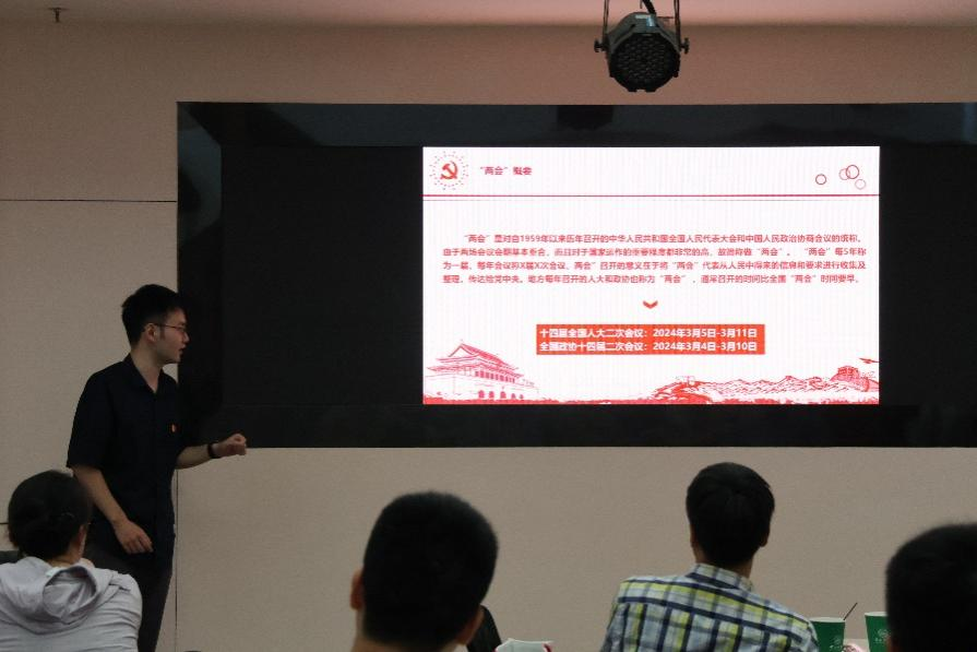 随后,博士第一党支部书记彭琢雅同志以微党课形式带领与会党员共同学习2024年全国“两会”的重要内容,包括国家的最新政策导向、经济社会发展的重点任务以及对教育和科研领域的新要求。彭琢雅同志鼓励大家要深入学习“两会”精神,攻坚克难,脚踏实地,努力做好科研工作,以自身专业知识助力新质生产力发展。