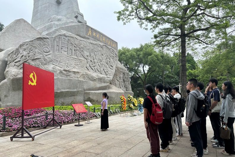 4月26日上午9点,全体成员抵达广州起义烈士陵园,跟随讲解员进行参观。广州起义烈士陵园是为纪念中国共产党领导的广州起义牺牲的烈士修建的纪念性公园。墓园内沉静肃穆,沿着宽阔的陵墓大道往前走,尽头便是高耸的广州起义纪念碑:一只巨手高擎步枪,冲破三块大石直指云天,象征着中国共产党领导的广州起义冲破“三座大山”的压迫,以武装夺取政权,彰显“枪杆子里面出政权”的真理。同学们跟随着讲解员的脚步,瞻仰广州起义纪念碑,参观广州公社烈士之墓,先烈们为国英勇奋斗的画面仿佛在眼前重现。通过讲解和参观,同学们对广州起义的过程加深了解,进一步提升了作为党员的责任感和使命感。